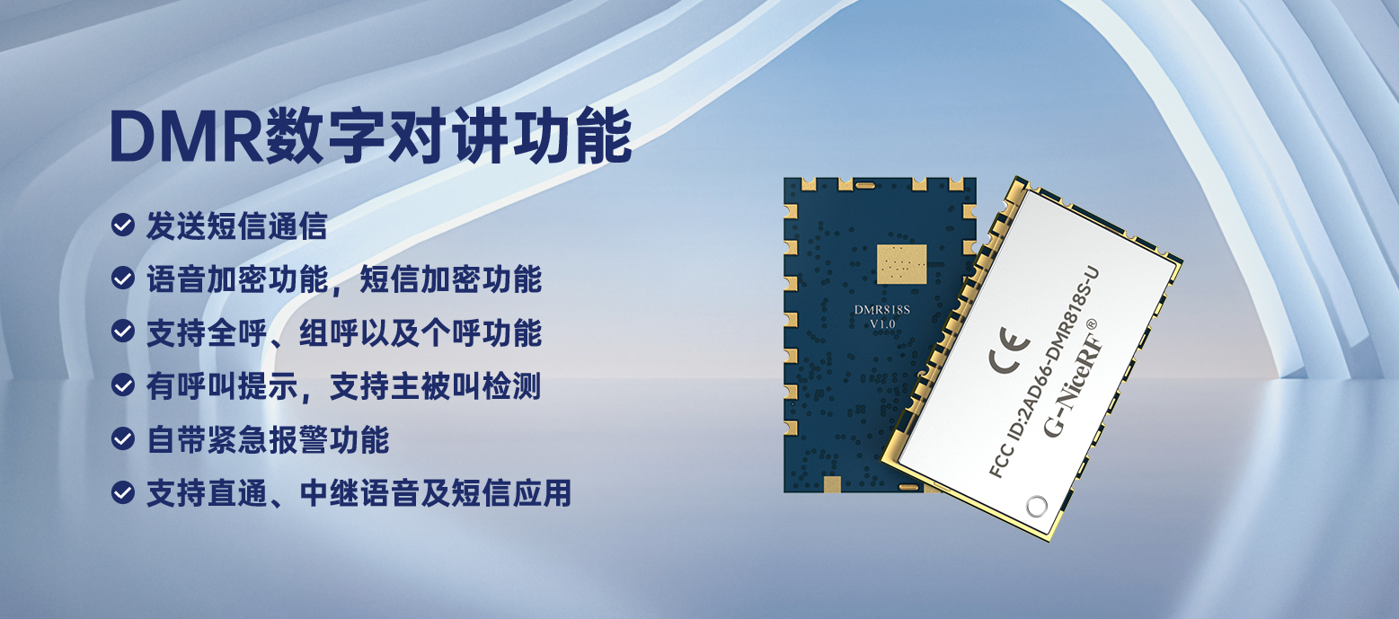 DMR818S嚴格使用無鉛工藝生產和測試,符合RoHS、Reach的標準。DMR818S模塊還可為客戶提供過FCC和CE雙認證的版本,以滿足不同市場需求。